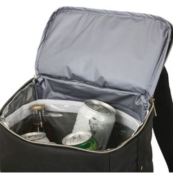 24-Can Highland Backpack Cooler is made from durable 600D material and features a zippered main compartment with heat sealed PEVA lining and a removable and cleanable clear insert. It also has a front pocket with buckles and magnetic snap closure, two side pockets, side D-rings, metal hardware, bottle opener and adjustable padded backpack straps.